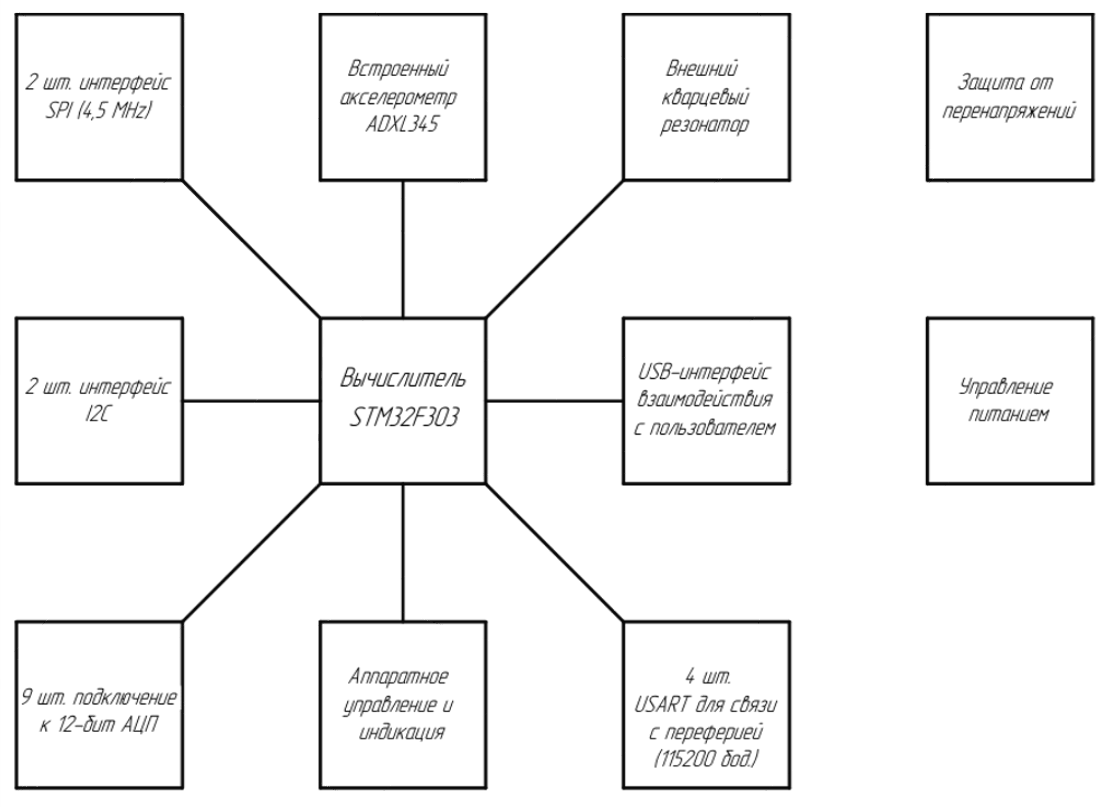 Для подключения максимального количества датчиков была выбрана микросхема STM32F303, компании ST Microelectronics, это дало возможность сделать 2 цифровых интерфейса I2C для большого количества подключенных датчиков (255 на один интерфейс), 2 интерфейса SPI для максимальной скорости работы с датчиком и 6 аналоговых цепи для получения сигналов с датчиков, которые не имеют цифровых интерфейсов. Присутствуют 2 канала UART для взаимодействия с конечным оборудованием, связь с STM32F303 и USB – интерфейс для связи с ПК.